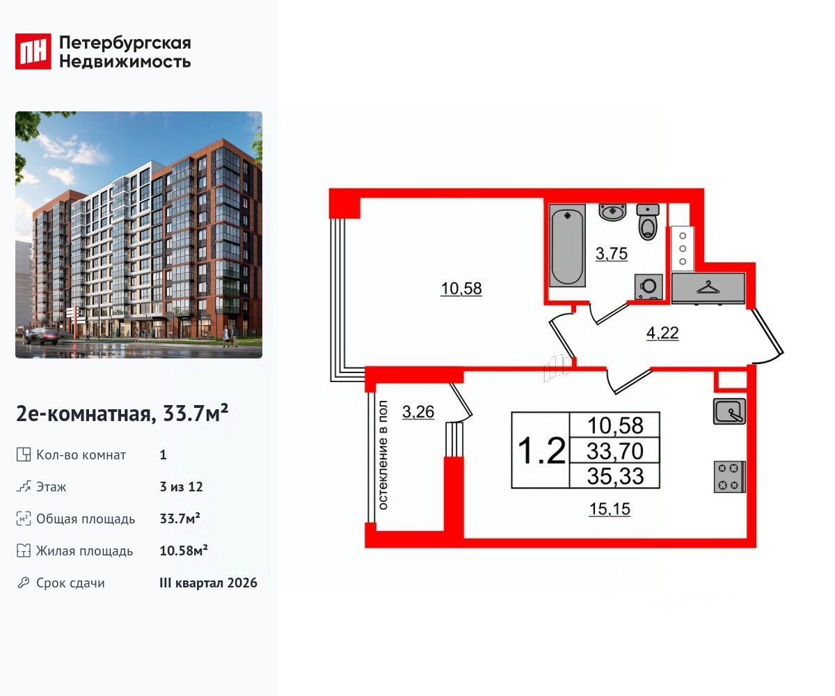 Удобная, классическая, функциональная европланировка, большая кухня-гостиная 15.15 м², просторная прихожая 4.22 м². Общая площадь квартиры - 33.7 м², жилая 10.58 м², высота потолка 2.77 м.