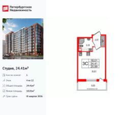 Удобная, классическая, функциональная европланировка, вместительная прихожая 3.07 м². Общая площадь студии - 24.41 м², жилая 18.01 м², высота потолка 2.77 м.