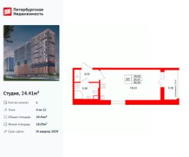 Удобная, классическая, функциональная европланировка, вместительная прихожая 3.03 м². Общая площадь студии - 24.41 м², жилая 18.03 м², высота потолка 2.77 м.