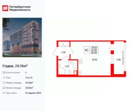 Удобная, классическая, функциональная европланировка, вместительная прихожая 3 м². Общая площадь студии - 24.56 м², жилая 18.02 м², высота потолка 2.77 м.