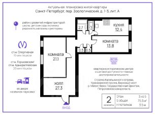 Общая площадь квартиры составляет 79,3 кв. м, жилая площадь - 34,9 кв. м, а кухня - 12,4 Квартира расположена на 3-м этаже пятиэтажного кирпичного дома, построенного в 1902 году. Дом после капитального ремонта. Высокие потолки 3.5 метра добавляют пространству ощущение легкости и свободы.Есть пассажирский лифт.