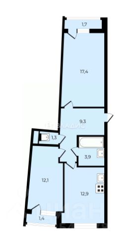 Общая площадь квартиры составляет 56.9 кв. м, жилая площадь — 30 кв. м, кухня — просторная, 14 кв. м., две раздельные комнаты.