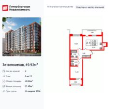 Уникальная, функциональная европланировка, большая кухня-гостиная 16.31 м², вместительная прихожая 5.89 м². Общая площадь квартиры - 49.92 м², жилая 21.49 м², высота потолка 2.77 м.