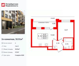 Удобная, классическая, функциональная европланировка, большая кухня-гостиная 14.62 м², вместительная прихожая 3.18 м². Общая площадь квартиры - 30.91 м², жилая 9.37 м², высота потолка 2.77 м.