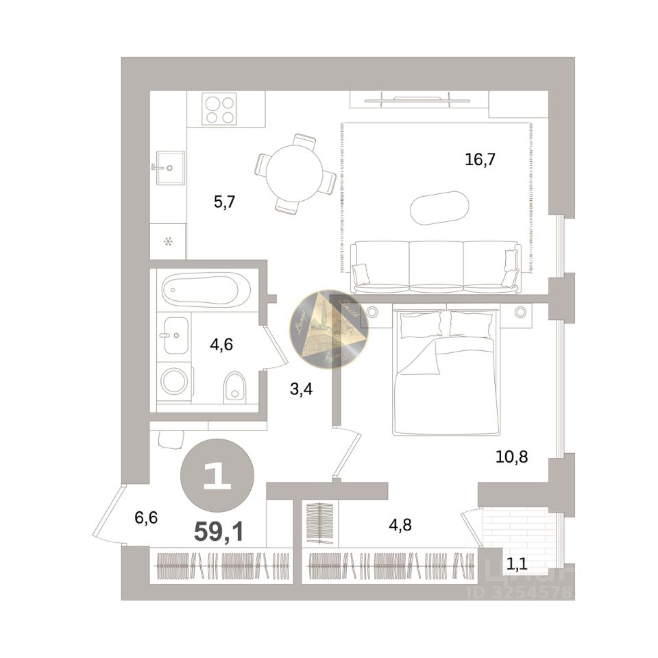 Квартира находится на 4/8 этаже. Общая площадь квартиры 59.1 м2.
