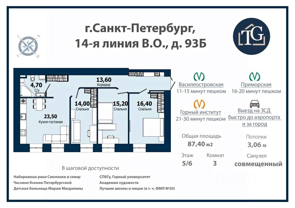 Шаговые расстояния до всего важного: Набережная реки Смоленки и сквер для прогулок с видом на воду, Часовня Ксении Петербургской, Детская больница Марии Магдалины, СПбГУ, Горный университет, Академия художеств, лучшие школы и лицеи (в т.ч. ФМЛ N30).