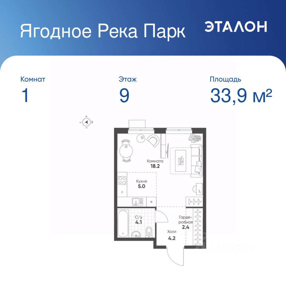 Общая площадь квартиры — 33.9 кв. м, этаж 9 из 12.