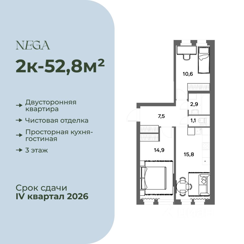 Продаётся 2-комнатная квартира 52,8 м² в эко-квартале NEGA в Новом Девяткино. Квартира находится на 3 этаже пятиэтажного дома — это единственный комплекс такого формата в Девяткино, без "стены" из высоток за окном. Планировка позволяет разделить приватную и общую зоны, удобно расставить мебель и организовать хранение. Отделка от застройщика: можно въехать сразу после сделки или сделать интерьер под себя без лишних переделок.