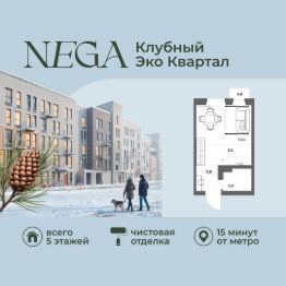 Продаётся квартира-студия 21,2 м² в эко-квартале NEGA в Новом Девяткино. Квартира находится на 3 этаже пятиэтажного дома — это единственный комплекс такого формата в Девяткино, без "стены" из высоток за окном. Планировка позволяет разделить приватную и общую зоны, удобно расставить мебель и организовать хранение. Отделка от застройщика: можно въехать сразу после сделки или сделать интерьер под себя без лишних переделок. NEGA — квартал для тех, кто хочет жить у природы, а не просто "видеть её издалека". Дома стоят рядом с лесом и прудом, поэтому из двора буквально несколько минут до прогулочных троп и воды. Территория закрыта от посторонних и машин: транспорт остаётся по периметру, внутри — только люди, детские игры и прогулки. Во дворе расположены детские и спортивные площадки, зоны спокойного отдыха и собственный детский сад — пространство читается и для ребёнка, и для взрослого. Входы в дома устроены с уровня земли, без высоких ступеней и крутых пандусов — удобно заходить с коляской, велосипедом, самокатом или с покупками в руках. В подъездах предусмотрены колясочные и аккуратные общие зоны в нейтральной гамме, которые поддерживают ощущение домашнего, а не "офисного" пространства. При этом NEGA не отрывает от города. До метро "Девяткино" примерно 15 минут на машине: легко добраться до Петербурга на работу или учёбу и вернуться в более спокойную зеленую среду. В пешей доступности от квартала — магазины, детские сады, школы, бытовые сервисы и остановки общественного транспорта. Квартира в NEGA подойдет тем, кому важны лес, вода и малоэтажная застройка, но при этом нужна нормальная транспортная доступность и привычная городская инфраструктура рядом с домом.