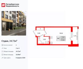 Удобная, классическая, функциональная европланировка, вместительная прихожая 3.05 м². Общая площадь студии - 24.72 м², жилая 18.04 м², высота потолка 2.77 м.
