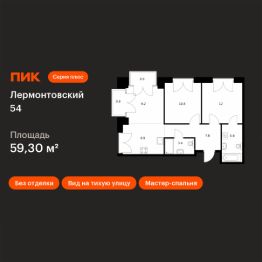 Продаётся 2-комн. квартира площадью 59,3 кв.м на 5 этаже 7 этажного дома (Корпус 2.1, Секция 1) проекта ПИК Лермонтовский 54. Светлый просторный подъезд на уровне земли, функциональная планировка, большие окна, без отделки.