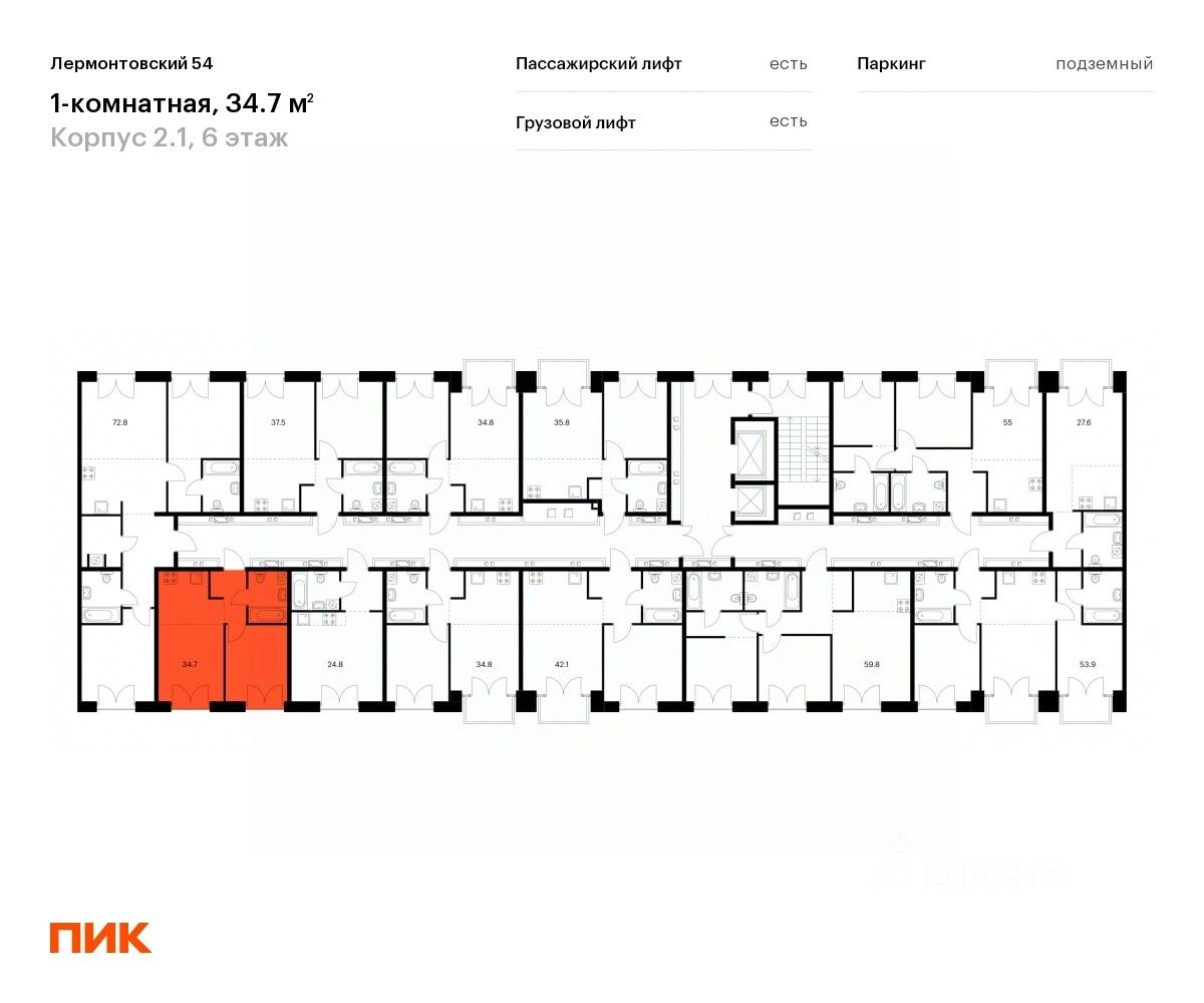 Продаётся 1-комн. квартира площадью 34,7 кв.м на 6 этаже 9 этажного дома (Корпус 2.1, Секция 6) проекта ПИК Лермонтовский 54. Светлый просторный подъезд на уровне земли, функциональная планировка, большие окна, без отделки.