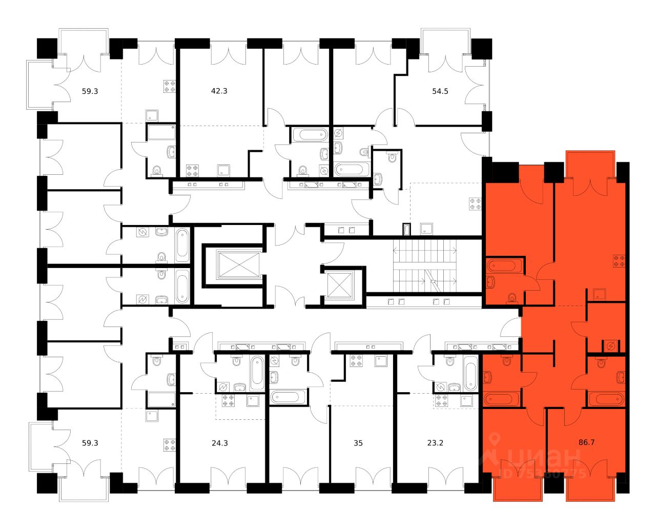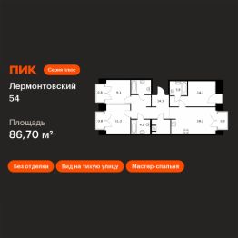 Продаётся 3-комн. квартира площадью 86,7 кв.м на 3 этаже 7 этажного дома (Корпус 2.1, Секция 7) проекта ПИК Лермонтовский 54. Светлый просторный подъезд на уровне земли, функциональная планировка, большие окна, без отделки.