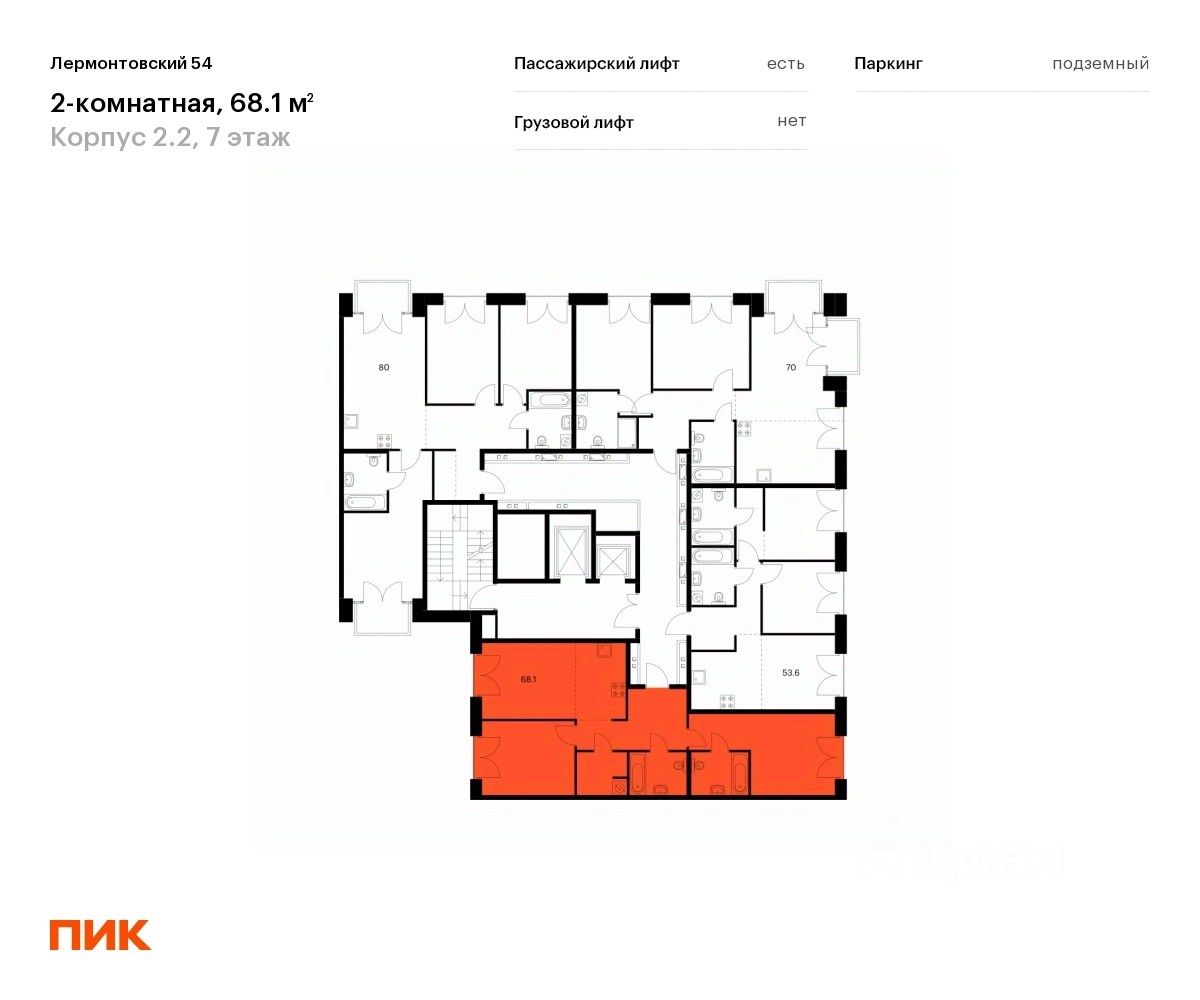Продаётся 2-комн. квартира площадью 68,1 кв.м на 7 этаже 9 этажного дома (Корпус 2.2, Секция 12) проекта ПИК Лермонтовский 54. Светлый просторный подъезд на уровне земли, функциональная планировка, большие окна, без отделки.