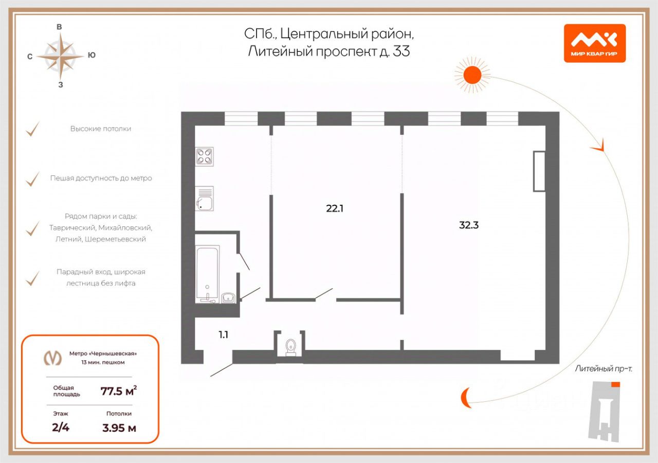 Квартира расположена на втором этаже и встречает вас истинным петербургским размахом: высота потолков 3,95 метра создает ощущение простора и величия. Главным украшением интерьера являются большие окна, выходящие на восток. По утрам помещения залиты мягким и ярким солнечным светом, что делает атмосферу невероятно светлой, живой и оптимистичной.