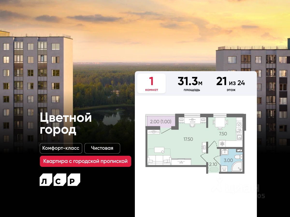 Продается 1-комнатная квартира в ЖК "Цветной город" на 21 этаже. Общая площадь составляет 31.30 кв. м. Квартира с чистовой отделкой Срок сдачи дома: 4 квартал 2025. Жилой комплекс "Цветной город" располагается по адресу Санкт-Петербург, Красногвардейский.