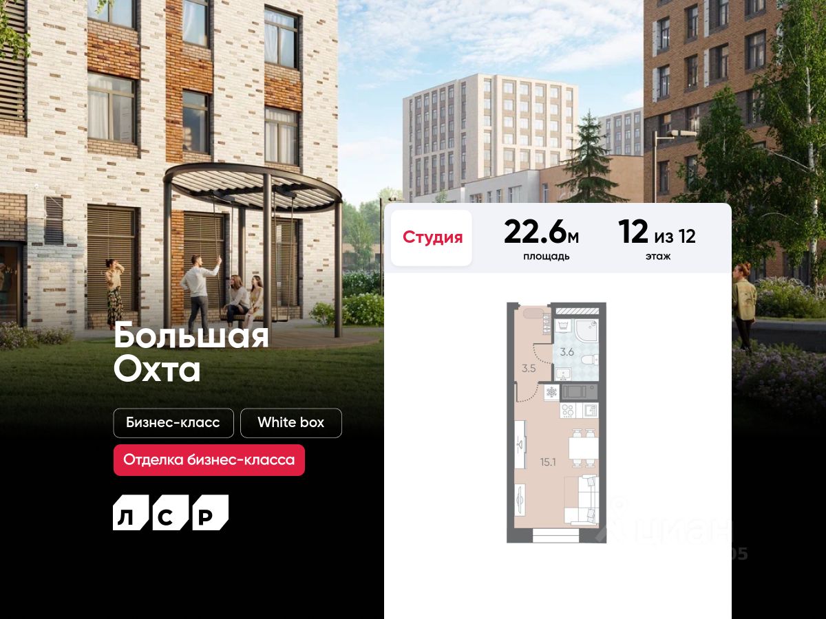Продаётся студия в ЖК "Большая Охта" на 12 этаже. Общая площадь составляет 22.60 кв. м. Квартира с white box отделкой. Жилой комплекс "Большая Охта" располагается по адресу Санкт-Петербург, Красногвардейский.