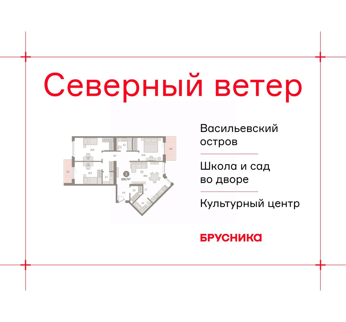 Продается 3-комн. квартира от застройщика с предчистовой отделкой в ЖК "Северный ветер" на 8 этаже. Общая площадь: 104.33 кв.м., жилая: 40.8 кв.м., площадь просторной кухни-столовой: 26.6 кв.м. Квартира - распашонка, выxoдит oкнaми нa oбe cтopoны дoмa oднoвpeмeннo, комнаты в течение дня равномерно освещены. В квартире два балкона, два совмещенных санузла. Высота потолков 2.98 м.