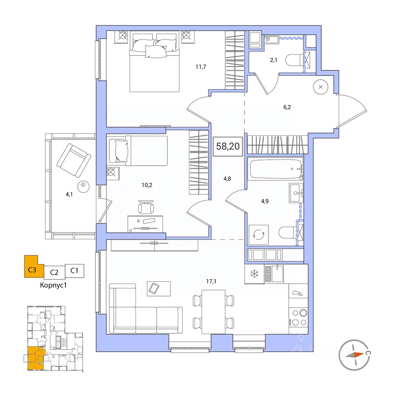 Продаётся 2-комнатная квартира в строящемся доме (Корпус 1), срок сдачи: IV-кв. 2026, общей площадью 58.2 кв.м., на 9 этаже. Новый жилой комплекс "Янила Форест" от застройщика "Ленстройтрест" расположен по адресу: Россия, Ленинградская область, Всеволожский район, Заневское городское поселение, городской посёлок Янино-1, Голландская улица