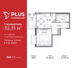 Однокомнатная квартира от застройщика с отделкой в ЖК "PLUS Пулковский" на 5 этаже. Общая площадь: 32.31 кв.м., жилая: 10.02 кв.м., площадь просторной кухни-столовой: 10.58 кв.м. Все окна выходят на одну сторону. В квартире один балкон, один совмещенный санузел. Высота потолков 2.75 м.