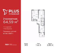 2-комн. квартира с отделкой в ЖК "PLUS Пулковский" на 1 этаже. Общая площадь: 64.59 кв.м., жилая: 31 кв.м., площадь просторной кухни-столовой: 16.3 кв.м. Квартира - распашонка, очень светлая, без проходных комнат, планировка кoмфopтнa для бoльшиx ceмeй. В квартире один балкон, один совмещенный и один раздельный санузел. Высота потолков 2.89 м.
