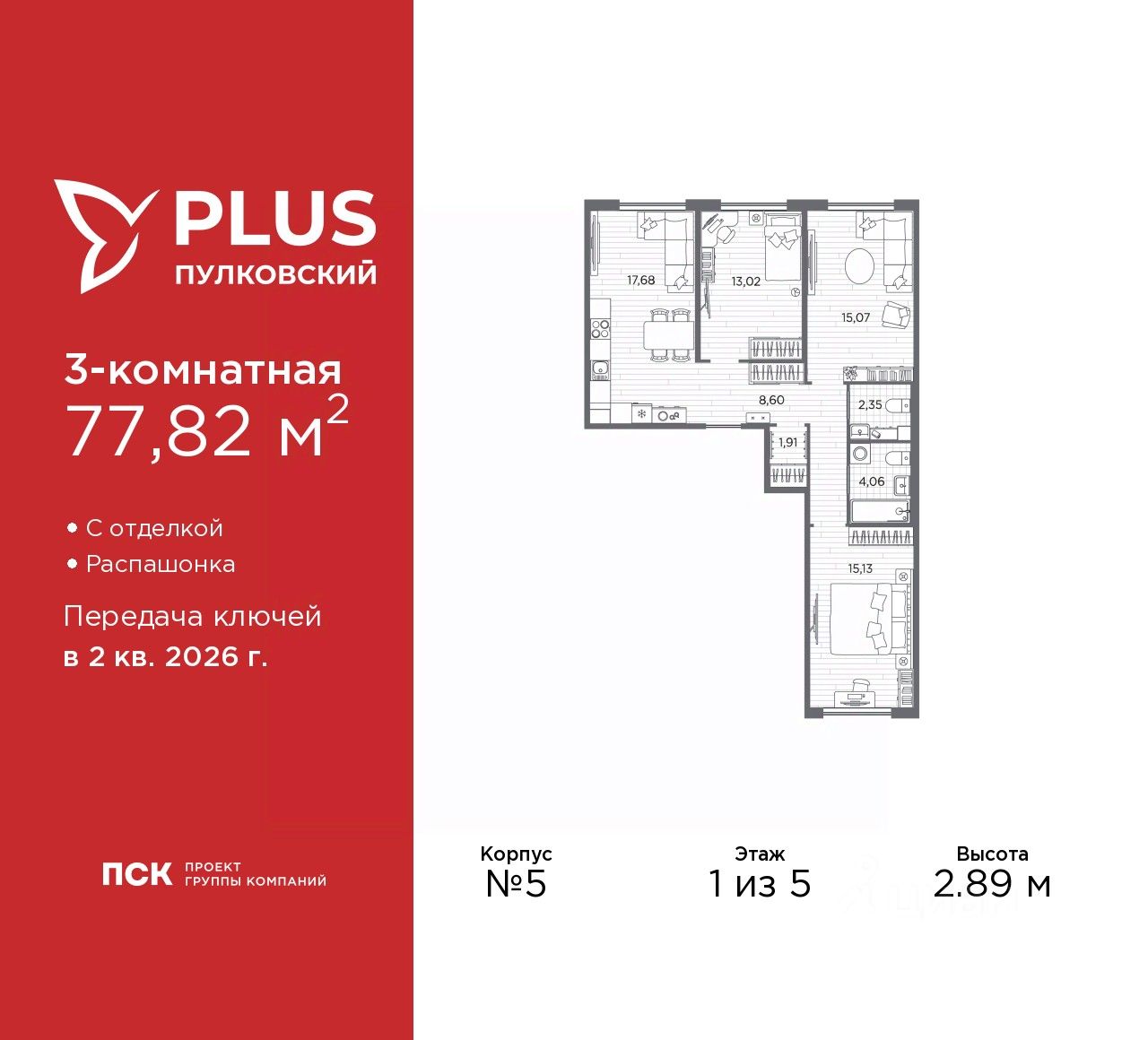 Просторная 3-комн. квартира с отделкой в ЖК "PLUS Пулковский" на 1 этаже. Общая площадь: 77.82 кв.м., жилая: 43.22 кв.м., площадь просторной кухни-столовой: 17.68 кв.м. Квартира - распашонка, без проходных комнат, окна выходят на paзные стороны дома. В квартире один совмещенный и один раздельный санузел. Высота потолков 2.89 м.