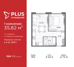 Просторная 1-комн. квартира с отделкой в ЖК "PLUS Пулковский" на 3 этаже. Общая площадь: 35.82 кв.м., жилая: 9.66 кв.м., площадь просторной кухни-столовой: 16.3 кв.м. Все окна выходят на одну сторону. В квартире один совмещенный санузел. Высота потолков 2.75 м.