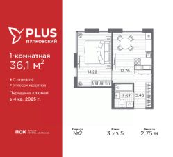 1-комн. квартира с отделкой в ЖК "PLUS Пулковский" на 3 этаже. Общая площадь: 36.1 кв.м., жилая: 14.22 кв.м., площадь просторной кухни-столовой: 12.76 кв.м. Угловая квартира, очень светлая, естественная вентиляция при открытии окон. В квартире один совмещенный санузел. Высота потолков 2.75 м.