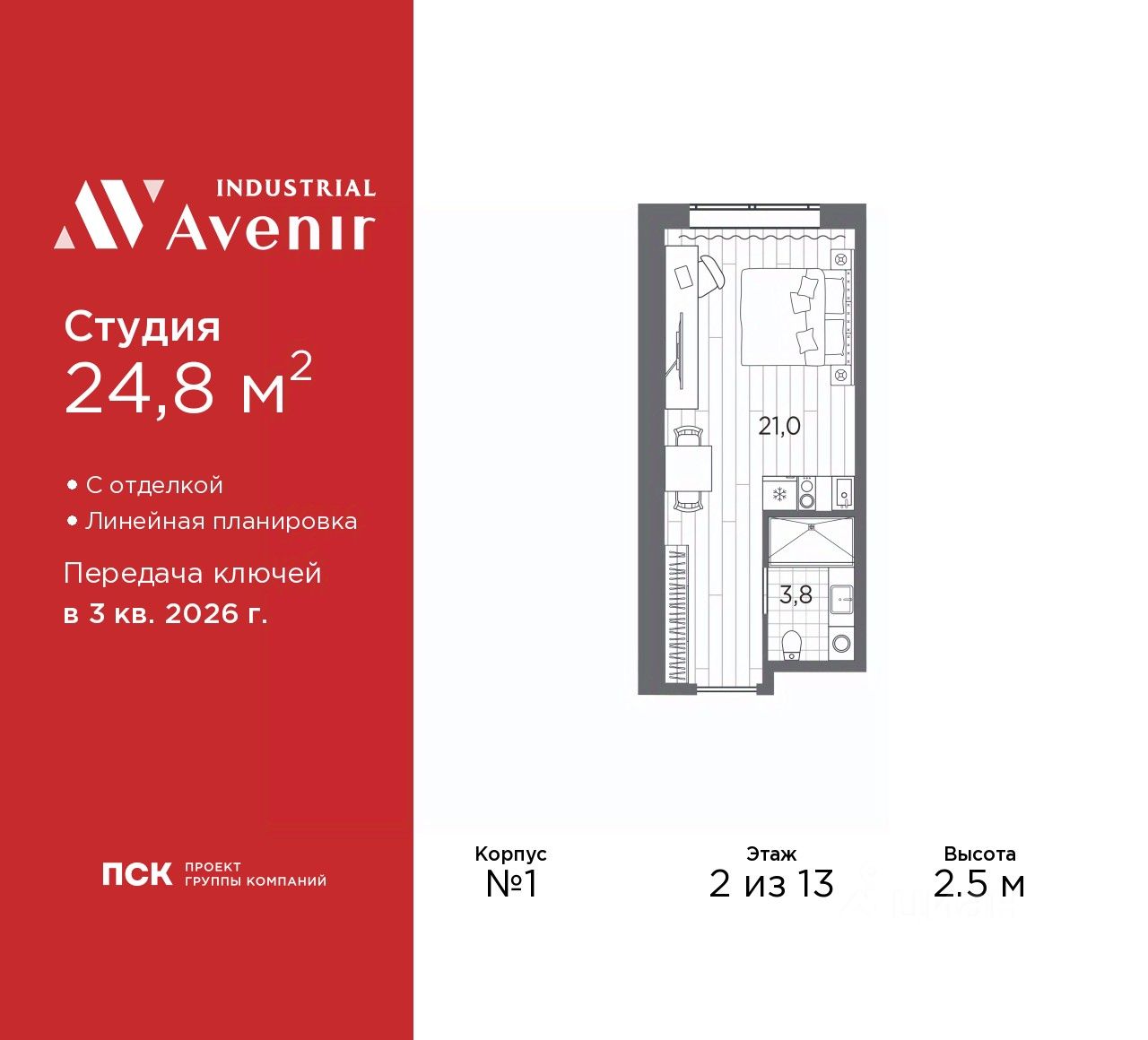 Однокомнатные апартаменты-студия от застройщика с отделкой в ЖК "Industrial AVENIR" на 2 этаже. Общая площадь: 24.8 кв.м., площадь гостиной 21 кв.м., из которых 5 кв.м. выделено под кухонную зону. Все окна выходят на одну сторону. В апартаментах один совмещенный санузел. Высота потолков 2.5 м.