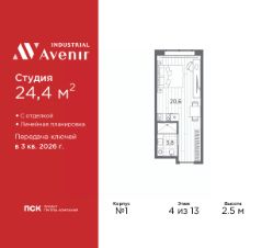 Продаются однокомнатные апартаменты-студия с отделкой в ЖК "Industrial AVENIR" на 4 этаже. Общая площадь: 24.4 кв.м., площадь гостиной 20.6 кв.м., из которых 5 кв.м. выделено под кухонную зону. Все окна выходят на одну сторону. В апартаментах один совмещенный санузел. Высота потолков 2.5 м.