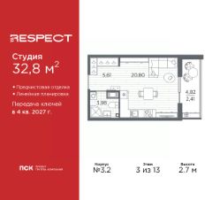 Однокомнатная квартира-студия с предчистовой отделкой в ЖК "RESPECT" на 3 этаже. Общая площадь: 32.8 кв.м., площадь гостиной 20.8 кв.м., из которых 5 кв.м. выделено под кухонную зону. Все окна выходят на одну сторону. В квартире один балкон, один совмещенный санузел. Высота потолков 2.7 м.