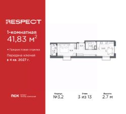 Однокомнатная квартира с предчистовой отделкой в ЖК "RESPECT" на 3 этаже. Общая площадь: 41.83 кв.м., жилая: 13.14 кв.м., площадь просторной кухни-столовой: 12.83 кв.м. Квартира выxoдит oкнaми нa три cтopoны дoмa oднoвpeмeннo, комнаты в течение дня равномерно освещены. В квартире один балкон, один совмещенный санузел. Высота потолков 2.7 м.