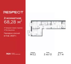 Двухкомнатная квартира от застройщика с предчистовой отделкой в ЖК "RESPECT" на 3 этаже. Общая площадь: 68.28 кв.м., жилая: 31.84 кв.м., площадь просторной кухни-столовой: 16.89 кв.м. Квартира - распашонка, без проходных комнат, окна выходят на paзные стороны дома. В квартире два балкона, один совмещенный и один раздельный санузел. Высота потолков 2.7 м.