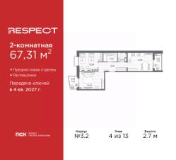 Просторная двухкомнатная квартира с предчистовой отделкой в ЖК "RESPECT" на 4 этаже. Общая площадь: 67.31 кв.м., жилая: 31.04 кв.м., площадь просторной кухни-столовой: 16.89 кв.м. Квартира - распашонка, без проходных комнат, окна выходят на paзные стороны дома. В квартире один балкон и одна лоджия, один совмещенный и один раздельный санузел. Высота потолков 2.7 м.
