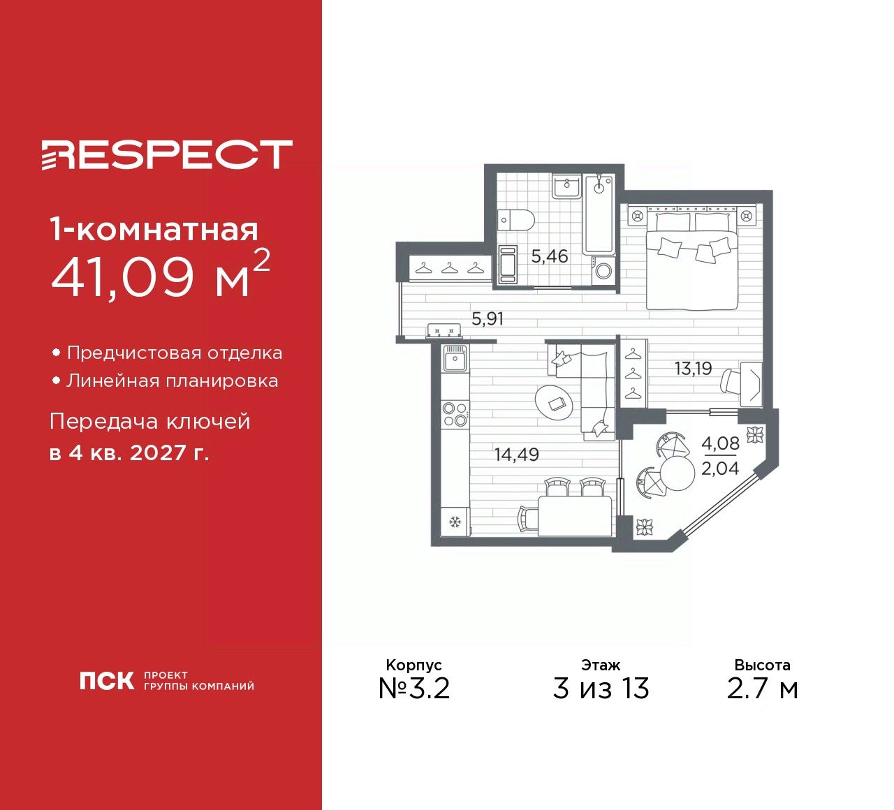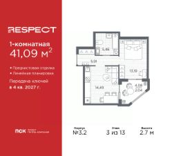 Просторная 1-комн. квартира с предчистовой отделкой в ЖК "RESPECT" на 3 этаже. Общая площадь: 41.09 кв.м., жилая: 13.19 кв.м., площадь просторной кухни-столовой: 14.49 кв.м. Все окна выходят на одну сторону. В квартире одна лоджия, один совмещенный санузел. Высота потолков 2.7 м.
