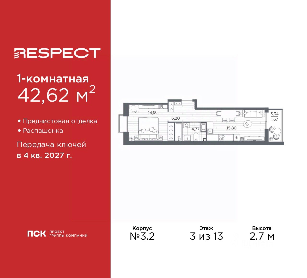 Однокомнатная квартира с предчистовой отделкой в ЖК "RESPECT" на 3 этаже. Общая площадь: 42.62 кв.м., жилая: 14.18 кв.м., площадь просторной кухни-столовой: 15.8 кв.м. Квартира - распашонка, без проходных комнат, окна выходят на paзные стороны дома. В квартире один балкон, один совмещенный санузел. Высота потолков 2.7 м.