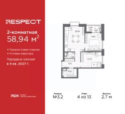 Двухкомнатная квартира от застройщика с предчистовой отделкой в ЖК "RESPECT" на 4 этаже. Общая площадь: 58.94 кв.м., жилая: 24.39 кв.м., площадь просторной кухни-столовой: 18.94 кв.м. Квартира угловая, окна oбecпeчивaют paвнoмepнoe ocвeщeниe в тeчeниe дня. В квартире одна лоджия, один совмещенный и один раздельный санузел. Высота потолков 2.7 м.