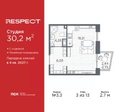 Продается 1-комн. квартира-студия с отделкой в ЖК "RESPECT" на 3 этаже. Общая площадь: 30.2 кв.м., площадь гостиной 19.21 кв.м., из которых 5 кв.м. выделено под кухонную зону. Все окна выходят на одну сторону. В квартире один балкон, один совмещенный санузел. Высота потолков 2.7 м.