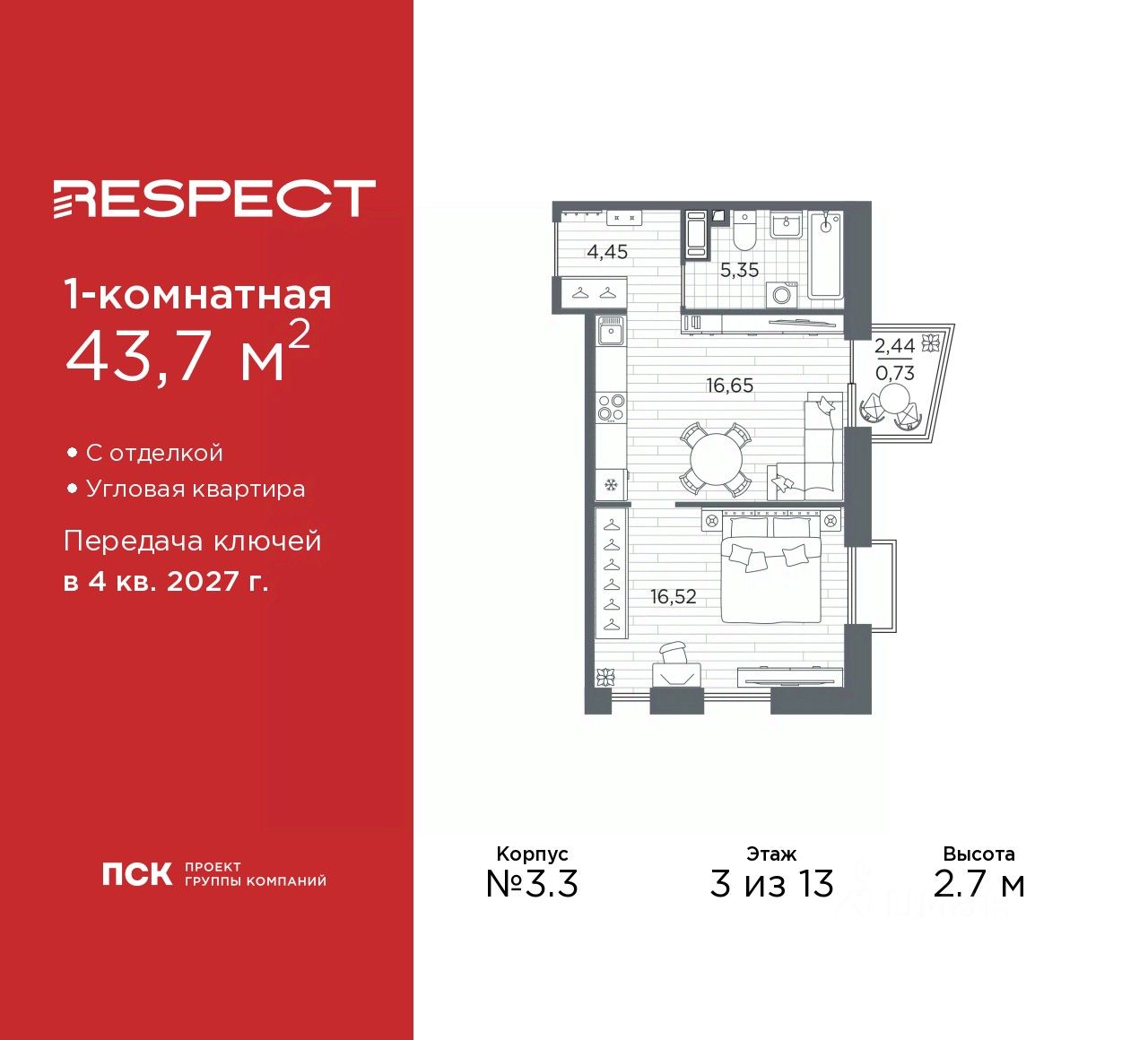1-комн. квартира от застройщика с отделкой в ЖК "RESPECT" на 3 этаже. Общая площадь: 43.7 кв.м., жилая: 16.52 кв.м., площадь просторной кухни-столовой: 16.65 кв.м. Угловая квартира, очень светлая, естественная вентиляция при открытии окон. В квартире один балкон, один совмещенный санузел. Высота потолков 2.7 м.