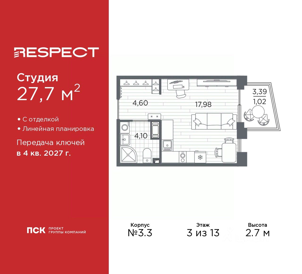 1-комн. квартира-студия с отделкой в ЖК "RESPECT" на 3 этаже. Общая площадь: 27.7 кв.м., площадь гостиной 17.98 кв.м., из которых 5 кв.м. выделено под кухонную зону. Все окна выходят на одну сторону. В квартире один балкон, один совмещенный санузел. Высота потолков 2.7 м.