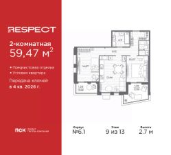 Продается 2-комн. квартира с предчистовой отделкой в ЖК "RESPECT" на 9 этаже. Общая площадь: 59.47 кв.м., жилая: 25.34 кв.м., площадь просторной кухни-столовой: 17.44 кв.м. Угловая квартира, идеально подойдет любителям тишины и панорамных видов. В квартире две лоджии, один совмещенный и один раздельный санузел. Высота потолков 2.7 м.