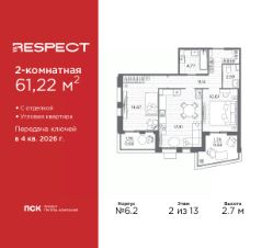 2-комн. квартира от застройщика с отделкой в ЖК "RESPECT" на 2 этаже. Общая площадь: 61.22 кв.м., жилая: 25.34 кв.м., площадь просторной кухни-столовой: 17.91 кв.м. Угловая квартира, идеально подойдет любителям тишины и панорамных видов. В квартире две лоджии, один совмещенный и один раздельный санузел. Высота потолков 2.7 м.