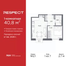 1-комн. квартира с предчистовой отделкой в ЖК "RESPECT" на 1 этаже. Общая площадь: 40.8 кв.м., жилая: 11.45 кв.м., площадь просторной кухни-столовой: 19.2 кв.м. Все окна выходят на одну сторону. В квартире один совмещенный санузел. Высота потолков 2.7 м.