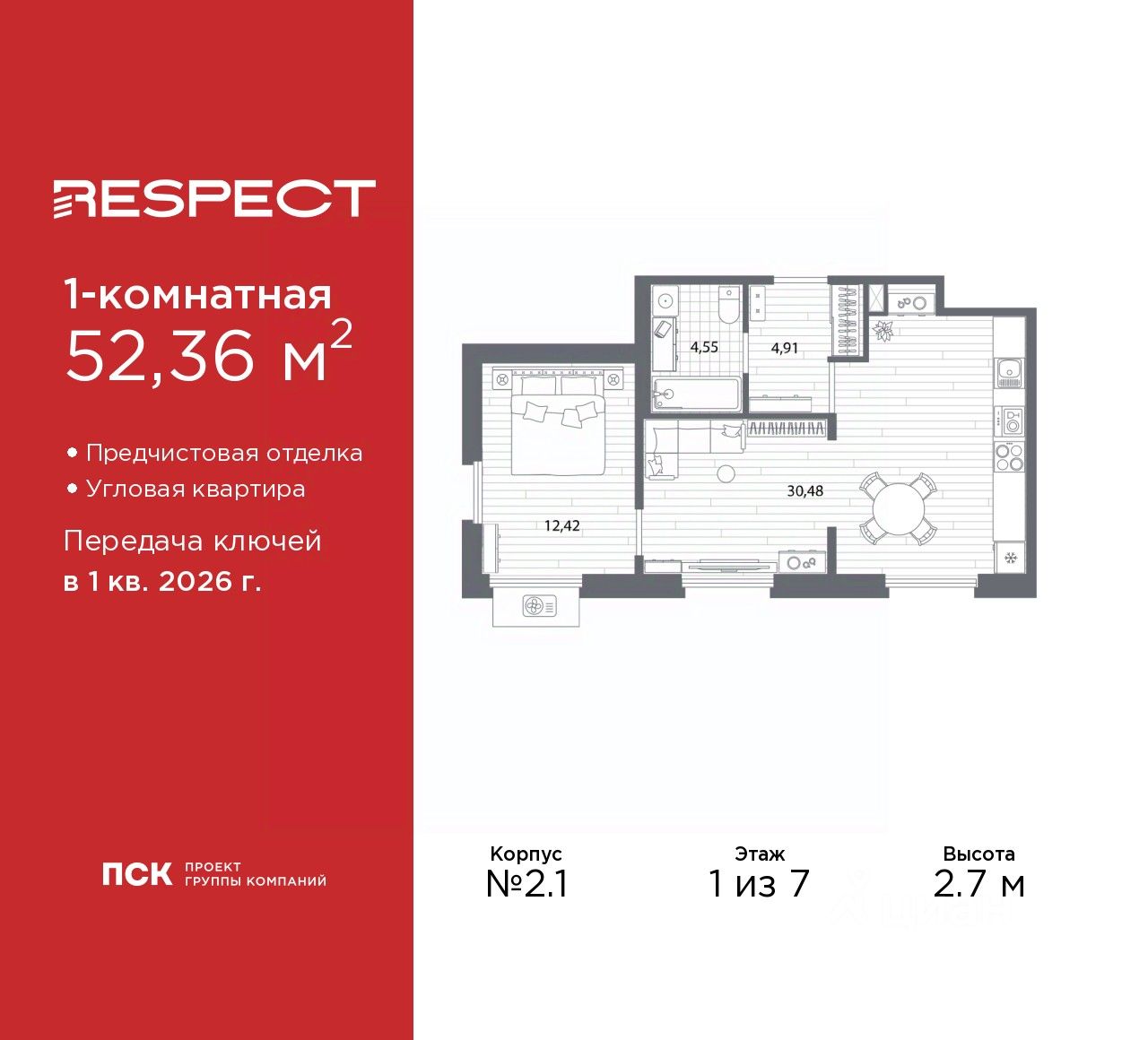 Просторная однокомнатная квартира с предчистовой отделкой в ЖК "RESPECT" на 1 этаже. Общая площадь: 52.36 кв.м., жилая: 12.42 кв.м., площадь просторной кухни-столовой: 30.48 кв.м. Квартира угловая, очень светлая, естественная вентиляция при открытии окон. В квартире один совмещенный санузел. Высота потолков 2.7 м.