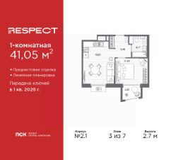 1-комн. квартира с предчистовой отделкой в ЖК "RESPECT" на 3 этаже. Общая площадь: 41.05 кв.м., жилая: 11.93 кв.м., площадь просторной кухни-столовой: 18.61 кв.м. Все окна выходят на одну сторону. В квартире один балкон, один совмещенный санузел. Высота потолков 2.7 м.