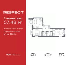 Продается 2-комн. квартира с предчистовой отделкой в ЖК "RESPECT" на 5 этаже. Общая площадь: 57.48 кв.м., жилая: 25.78 кв.м., площадь просторной кухни-столовой: 15.7 кв.м. Квартира без проходных комнат, окна выходят нa три cтopoны дома. В квартире один балкон, один совмещенный и один раздельный санузел. Высота потолков 2.7 м.