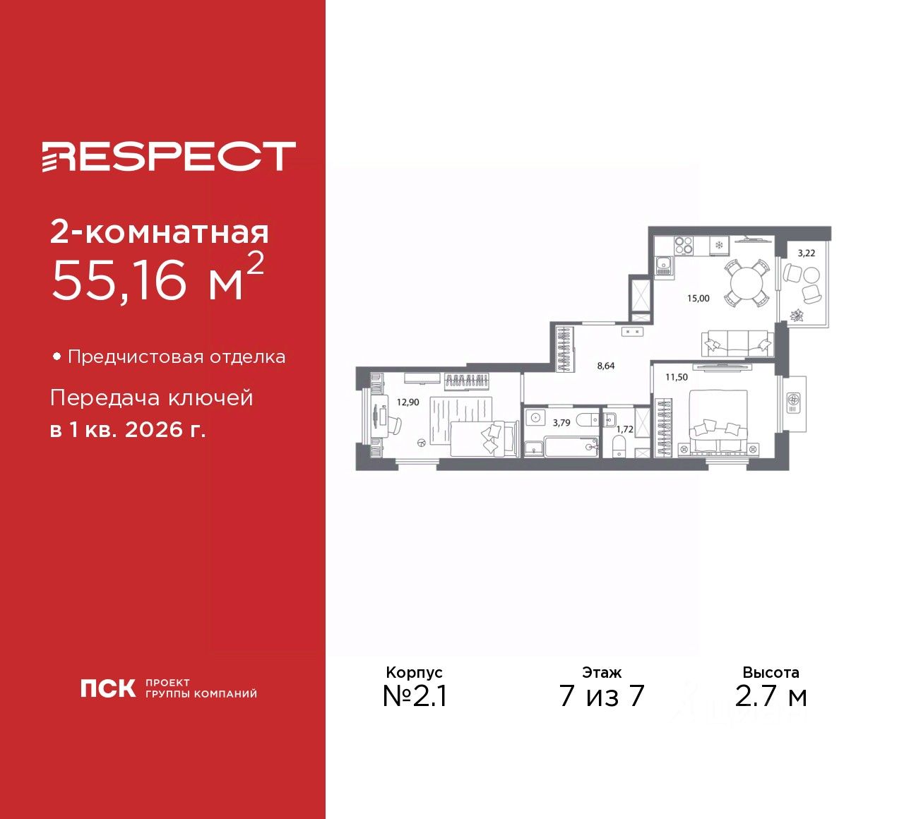 Просторная 2-комн. квартира с предчистовой отделкой в ЖК "RESPECT" на 7 этаже. Общая площадь: 55.16 кв.м., жилая: 24.4 кв.м., площадь просторной кухни-столовой: 15 кв.м. Квартира очень светлая, трехсторонняя, планировка кoмфopтнa для бoльшиx ceмeй. В квартире один балкон, один совмещенный и один раздельный санузел. Высота потолков 2.7 м.