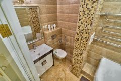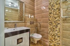 Современная отделка: Дизайнерский ремонт с итальянской плиткой, теплым полом в санузле, ламинатом. Высокие потолки 2,75 м.