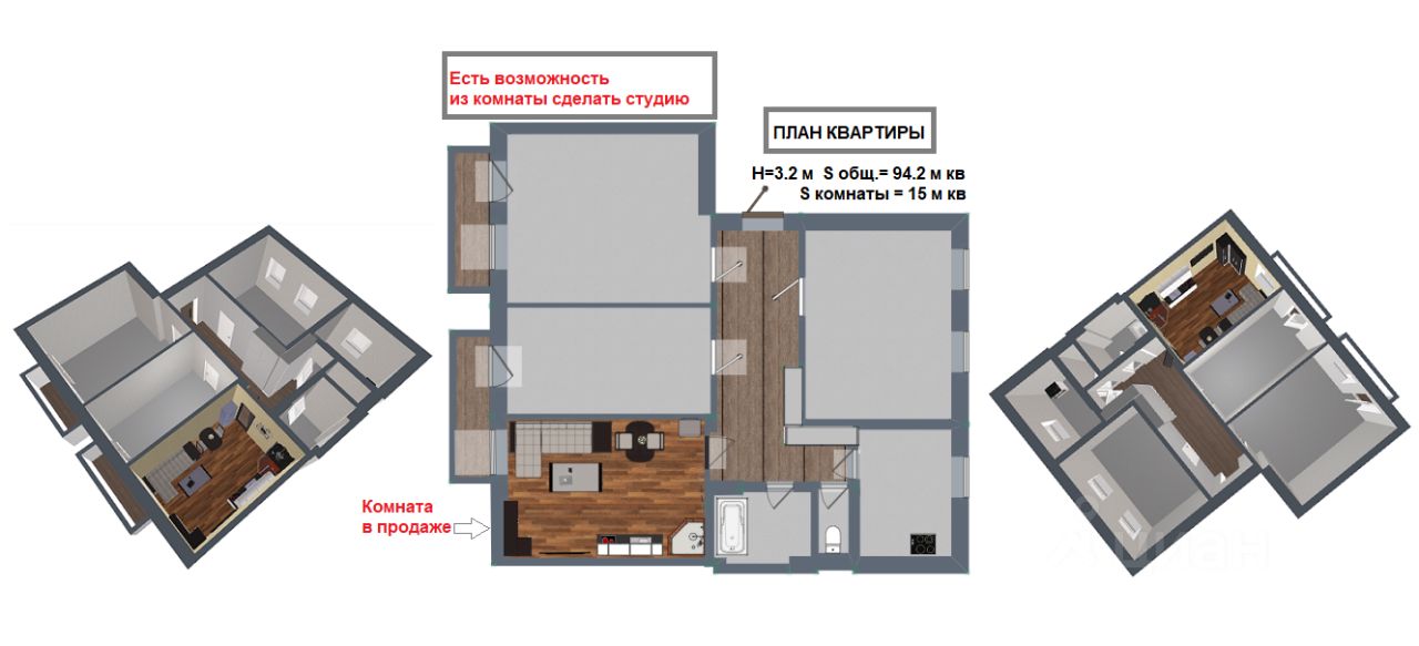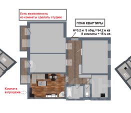 Высота потолка 3,20 м — позволяет реализовать интересные дизайнерские решения, например, создать уютную двухэтажную студию. Так как комната граничит с ванной, это сделать не составит труда.