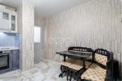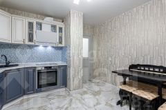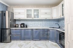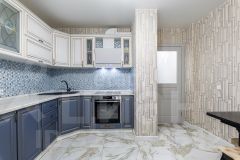 Обустроенная кухня в нежных голубых тонах площадью 13,6 кв.м располагает достаточной зоной для приготовления пищи и обеденной зоны
